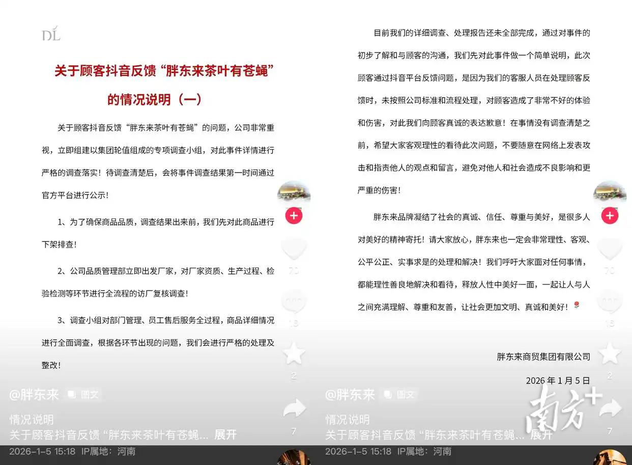 日前,有消费者反馈胖东来茶叶包装内出现苍蝇,相关视频发布后迅速引发关注。1月5日,胖东来官方发布情况说明称,立即组建以集团轮值组成的专项调查小组调查落实,对顾客真诚表达歉意,并启动多维度排查整改措施。